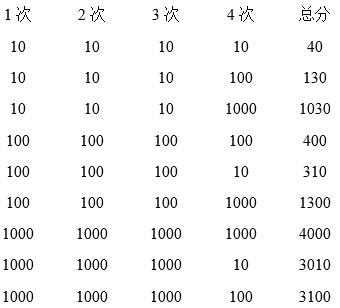 分析:已知“根据落点的不同可以得到10分、100分或1000分。小明投了4次飞镖,4次都中靶”。可推出这4次飞镖都中靶得到的分数: