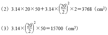 解答:分步列式:3.14×(20÷2)²×2=628(cm³)……………(4分)