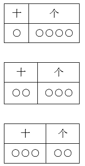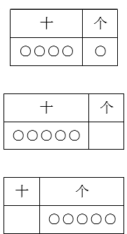分析:用5个○表示不同的数,可以是两位数,也可以是一位数。表示两位数时,十位上的数不能为0,所以当十位上有1个○时,个位上有4个○;当十位上有2个○时,个位上有3个○;当十位上有3个○时,个位上有2个○;当十位上有4个○时,个位上有1个○;当十位上有5个○时,个位上没有○。表示一位数时,十位上没有○,个位上有5个○。