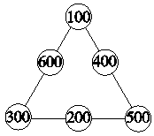 (2)分析:要使每条边上3个数的和都是1000,就要从6个数中选出3个数相加等于1000。200+300+500=1000,400+500+100=1000,600+300+100=1000,这3个式子中重复出现的数有100、300、500,因为三角形3个顶点