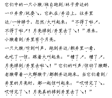 解析 本文情节简单,趣味性强。朗读时,要把握猴子们紧张、急切的心情,体会猴子们说话的语气、语调。其中,朗读“不得了啦,不得了啦!月亮掉到井里去了”“糟了,糟了,月亮掉到井里去啦”“哎呀完了,哎呀完了!月亮真的掉到井里去了”这几句话时,语速逐渐加快,读出猴子们看到水中的月亮时焦急、紧张的心情。最后一个自然段中老猴子的话可以用喘着气、很累的语气朗读,语速稍慢。另外,要注意停顿和重音。