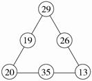 分析:(1)要使每条边上的三个数相加都得68,就是三条边上的三个数的和是68,左边的这条边可以列式为20+19=39,68-39=29,可知三角形顶点是29,右边的这条边还缺一个数,列式为68-29-13=26,底边缺少的数应该是20+13=33,68-33=35。