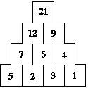 (2)通过所给出的数可以得出,3+1=4,也就是说下面一行的两个数相加等于上一行两个方格对应的数,从上数第二行的9和第三行的4就是9-4=5,可以得出7和4之间的数是5,那么5+7=12,9旁边的数是12,顶点的数字是12+9=21;知道第三行中间的数是5,可以算出最下面一行缺的两个数分别是5-3=2,7-2=5。