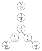 ,再把这7个分数填入题中的○里。要满足每条线上的3个分数的和都相等,其中处于中间位置的分数属于公有的分数,哪条线都要用到,填上这个分数后,要保证剩下的6个分数能组成3对和相等的式子,分别填在3条线剩余的○里。那么满足这个条件后,能填在中间的分数有3个,分别是