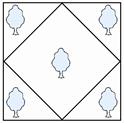 分析:在下面的这个大正方形里再画一个小正方形,使这个小正方形正好能把5棵树分隔在5个图形中。这个小正方形应该是斜放在大正方形之中的。可以在大正方形的每条边上找到正中间的一点,把它们顺次连接起来就成为一个小正方形。中间的一棵树放在小正方形里,周围的4棵树分别放在一个三角形里。