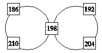 使通过观图可知,c是两个圈上的公共数,所以只要a+b=e+d就可以了。通过计算发现有多种填法,如a、b可以分别是186和210,e、d可以分别是192和204,c是198。