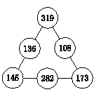 5.分析:因为每条线上的三个数相加都得600,所以可以从有两个已知数的那条线入手。先看左边这条线,已经知道136和145这两个数,那么上面○里应填600-136-145=319;再看右边这条线,已经知道319和108这两个数,那么右下角的○里应填600-319-108=173;最后看下面这条线,下面中间的○里应填600-145-173=282。