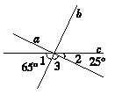 已知∠1=65°,∠2=25°,所以∠3=180°-65°-25°=90°,即直线a和直线b相交成的夹角是直角,所以直线a和直线b互相垂直。