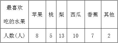 (2)、(3)小题通过观察统计表,可以从中找到答案。即最喜欢吃梨的同学最多,最喜欢吃梨的同学有13人,最喜欢吃苹果的同学有8人,最喜欢吃梨的同学比最喜欢吃苹果的同学多13-8=5(人)。