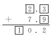 观察竖式,可知十分位上3+□应该等于12,所以□里填9,并向个位进1;个位上□+1+7应该等于□0,而7加进位的1得8,8再加2等于10,所以,□里填2;和的□里填1,所以,竖式为: