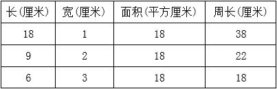 分析:“用18个面积是1平方厘米的正方形拼长方形”。因为长方形的面积=长×宽,所以,只要考虑哪两个数的乘积等于18,18=1×18,则长方形的长为18厘米,宽为1厘米;18=2×9,则长方形的长为9厘米,宽为2厘米;18=3×6,则长方形的长为6厘米,宽为3厘米,因此,一共有3种不同的拼法,再根据每种不同长方形的长与宽求出面积和周长。第一种长18厘米,宽1厘米,面积为18×1=18(平方厘米),周长为(18+1)×2=38(厘米);第二种长9厘米,宽2厘米,面积为9×2=18(平方厘米),周长为(9+2)×2=22(厘米);第三种长6厘米,宽3厘米,面积为=6×3=18(平方厘米),周长为(6+3)×2=18(厘米)。从中发现三种长方形的面积相等,周长不相等。
