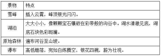 2.第二段分别描写了雪峰、森林、湖泊、瀑布集中景观,找到这几个关键词后,紧接着写的就是他们的特点,稍加提炼即可。