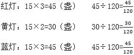 分析:根据已知条件可知,步行街一侧的彩灯是按“3盏红灯、2盏黄灯、3盏蓝灯”共8盏彩灯为一组排列的。由此可求出120盏彩灯一共有几个循环周期,再分别求出红灯、黄灯和蓝灯的盏数,最后分别除以120盏彩灯,即可求出红灯、黄灯和蓝灯各占彩灯总数的几分之几。