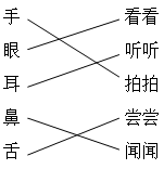2.根据手、眼、耳、鼻、舌的不同的功能连一连。应该是手拍拍、眼看看、耳听听、鼻闻闻、舌尝尝。