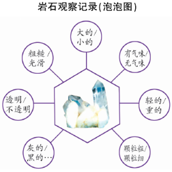 透明度、颜色、光滑度、颗粒大小、有无气味等。我们可以用手摸、鼻闻、轻轻敲打等方法来观察。