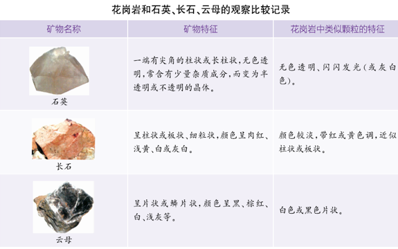 P70观察石英、长石、云母三种矿物标本,它们各有什么样的特点?把花岗岩里的颗粒分别和这三种矿物进行比较,我们能辨别出这些颗粒哪种是石英,哪种是长石,哪种是云母吗?