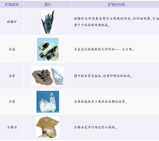 观察和描述矿物要从形状、颜色等外表特征进行。矿物的外表特征主要是指颜色、光泽、晶体形状等;除此之外,观察和描述矿物还要从硬度、条痕(粉末的颜色)、断口以及其他方面(如弹性、脆性、挠性等)进行。