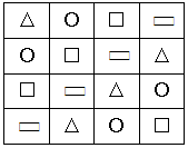 ,第四个图形只能是△。如果第三横行第三个图形是△,那么第三横行第四个图形就是○,第三竖行第四个图形也是○,从而得到第四横行第四个图形是□。如果第三横行第三个图形是○,那么第四横行第三个图形就是△,与第四横行第二个图形重复,所以这种情况不成立。