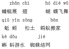 解析 这些词语都是由本课中的句子概括而成的,写出了课文中出现的六种动物在夏天活动时的情形。朗读时要读准字音,边读边思考每个词语的意思,细心观察词语的搭配,把这些词语牢牢记住,积累下来。