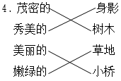 3.可以根据短文内容来填写。短文中“清可见底”是描写湖水的,“茂密”是形容树木的,“小花”开在草地上,湖上有一座美丽的“小桥”。