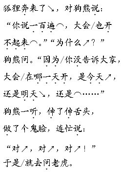 解析 这篇童话故事对各个动物的神态、动作和语言都做了细致的描写。特别是动物之间的对话,描写得更加细致。因此,在分角色朗读时,要抓住人物当时的心理,使用恰当的语气、语调来表达人物的思想感情。如,朗读狗熊的话时,要根据事情的发展读出狗熊的心理变化;读它用喇叭大声说通知时,声音一定要大,声音延长;朗读它发现自己的通知有错误时,要用诚恳的语气,读出狗熊的羞愧和诚恳的认错态度。