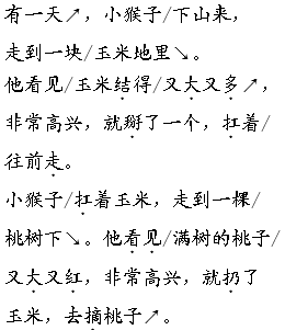 解析 这是一篇非常有教育意义的童话故事,因为小猴子做事不专心,不能有始有终,所以最终空手而归。在描写小猴子见到好东西就扔掉原来喜欢的东西去取时,运用了很多准确、生动的描写动作的词语:掰、扛、扔、摘、捧、抱等,朗读这些词语时,要加重语气;每次读到小猴子有所收获时,都要用高兴的语气,读出他快乐的心情;最终小猴子一事无成、空手而归,要用低沉的语气,放慢语速,读出他后悔、难过的心情。