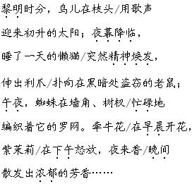 解析 本文的第一段,作者采用排比的修辞方法。先写动物在不同时候的表现,然后写植物在不同时候的表现,由此引出生物节律的话题。在背诵的时候要抓住重点词句,如:“黎明时分”“迎来初升的太阳”“夜幕降临”“精神焕发”“午夜”“编织着它的罗网”等。这样记住关键的词句,会加快记忆的速度,提高记忆的准确度。