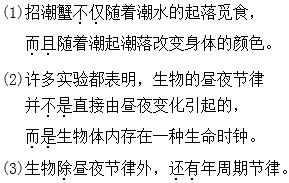 (2)这句话是表示并列关系的句子。它是想要否定生物的昼夜节律直接由昼夜变化引起的说法,从而肯定生物体内存在“生命时钟”。