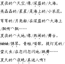 解析 这篇课文内容简单,而且语言优美,适合朗读。先熟读课文,在读熟的基础上,正确流利地朗读。边读边想象画面,读第1自然段时,重读“深蓝”“海上”等词语,“飘啊飘”读得轻些;读第2自然段时,重读“热闹”“弹琴”“唱歌”“跳舞”等词语;读第3自然段时,重读“夜晚”“真”等词语,进而体会课文表达的情感,感受夏夜景色的迷人。