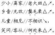 解析 这首诗写的是作者回到久别的家乡时的喜悦与感慨。首句点明本诗是回乡之作,突出了诗人离乡之久,回乡之晚,朗读时,语速放慢一点;次句承接上句,写自己的衰老之感,抒发了自己愈久愈深的乡土之情,朗读时,可以突出语调的变化,“无改”读得昂扬一点,“衰”读得起伏一些;后两句描绘了儿童问话这一饶有趣味的生活场景,朗读时,要读出儿童的天真烂漫。