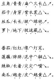 解析 背诵要在熟读的基础上进行。这首儿歌韵律感强,而且每行介绍一种蔬菜,或从其颜色或形状来加以描绘,或介绍其生长的地方。多读几遍,熟悉内容,记住这8种蔬菜的顺序,读得流畅了,再试着背诵,背诵时不要背一句对照一下课文,要将整首儿歌背完再从头检查,或请同桌帮助检查,这样效果会更好。