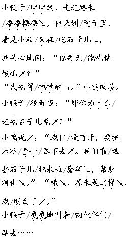 解析 这篇课文基本都是对话,适合进行分角色朗读。朗读要在熟读的基础上进行,先读懂课文内容,注意读准每一个字,还要注意长句子的读法,不但要读流利、读连贯、读出感情,还要注意读准语气语调。读小鸭子的话时,要用好奇、惊讶的语气;读小鸡的话时,要用平和的语气。