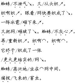 解析 本文是一篇含义深刻的短文,讲述了一只蜘蛛在织网中的经历。朗读时,要读出不同的语气和语调。读第1自然段时,总体要用陈述的语气,但最后一句话,要用惋惜的语气。读第2~4自然段时,要读出蜘蛛那种坚韧与顽强的精神,特别是读“织啊织”“织啊,织啊”这两句时,要放慢语速,用低沉的语调,体现出织的过程的漫长。读第5自然段时,要用欢快的语调,读出大功告成的那种高兴劲儿。