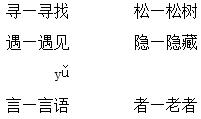 解析 这是对本课生字进行扩词的练习。有些生字,通过组词不但能加深记忆,而且对这个字的理解也有帮助。比如“寻”字,组词为“寻找”,“寻找”的意思就是“找”,由此可知,“寻”也是“找”的意思。这些练习,除“松—松树”“者—老者”外,其他都遵循这个规律。“松树”表示一种树,而“松”除表示松树外,还有形容词(松散,不紧密,不靠拢,跟“紧”相对)词性和动词(放开,使松散)词性。需要注意的是,“者”用在形容词或动词后,表示“……的人”,如“老者”就是“年纪大的人”。