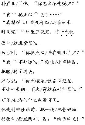 解析 本文对话较多,适合分角色朗读。朗读维佳的话时,宜用小声,读出难为情的语气;读科里亚的话时,宜用惊奇的语气;读米沙的话时,宜用告诫的语气;读伏洛佳的话时,宜用诚恳的语气。