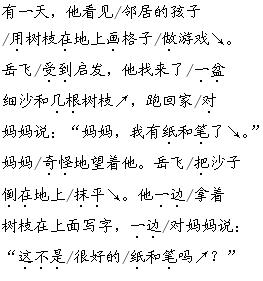 答案 岳飞小时候家里很穷,买不起纸和笔,他从邻居的孩子的游戏中受到启发,用细沙和树枝代替纸和笔练字。经过长期努力,岳飞终于练就了一手好字。