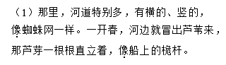 答案 (1)“像”是比喻词,把“河道”比作“蜘蛛网”,形象地写出了河道的纵横交错,而水乡的孩子就在这如迷宫般的、交错的河道中追寻着欢笑与快乐。“像船上的桅杆”“像升起了绿色的风帆”,不仅形象地写出了芦苇的样子及生长变化,而且让人感受到了那勃勃的春意及作者对家乡、对芦苇、对美好春天的喜爱之情。