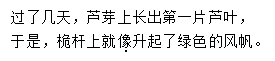 (2)船做好后,在船底吐上一口唾沫,跑到小木桥上,把芦叶船往河中央轻轻地一扔,保险翻不了船。船一下水,便顺着风儿开走了。