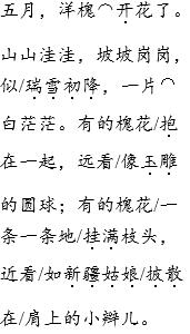 解析 作者用欢快、轻松、活泼的笔调,描绘了槐乡五月槐花开放时的动人景色和槐乡八月孩子们在劳动中获得的快乐。因此,要带着喜悦与憧憬之情来朗读。要读出重音,掌握好停顿,声音高昂,速度适中。
