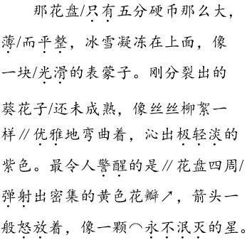 解析 本文语言优美流畅,朗读时,要怀着对这棵顽强的葵花的敬畏之情,全身心地投入到作品的形象当中去。第1自然段的朗读,要抓住“漫长”和“寒冷”来体会昆仑山自然环境的恶劣,读的时候语速要稍慢,语调要低沉,读出高原的悲壮与苍凉。第2~6自然段的朗读,要转为轻快的语气,读出收到葵花子时的兴奋与感叹。第7~9自然段的朗读,语调要上扬,语速要稍快一些,读出对葵花顽强的生命力的惊奇与赞美。第10~14自然段的朗读,先要以低沉的语调、缓慢的语速读出天气的恶劣,再用赞美、感叹的语气读出对这棵葵花顽强的生命力的敬意。最后一个自然段先用平缓的语气读,然后猛地顿住,发出心中的慨叹,表达对这棵葵花的赞美之情。
