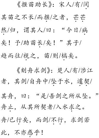 解析 要朗读好文言文,首先要做到恰当地“断句”,突出故事的情节与讽刺色彩。断句是朗读文言文的重点。如在读《揠苗助长》最后一句话时,应读成“其子/趋而往/视之,苗/则/槁矣”,这样断句,就将故事结局清楚明白地讲述出来了。其次要读出寓言的感情色彩。寓言往往都带有较强的讽刺意味,朗读时,应体现出讽刺色彩。如朗读宋人说的话时,就要带有自豪、炫耀的语气。