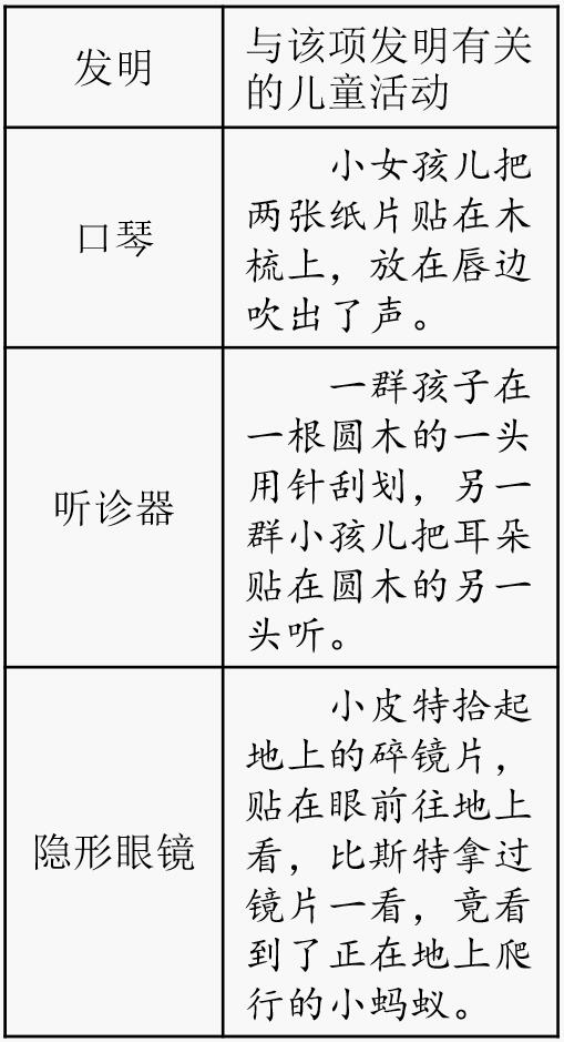 课文中介绍了几种与儿童有关的发明?摘抄有关内容填写在下面的表格里。