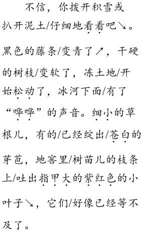 解析 本文是一篇优美的散文,语言生动,节奏感强,读时容易入境。在朗读时要体会作者的思想感情,读出对春天的向往、对生活和生命的热爱之情。例如,在读第二自然段时,要抓住作者列举的事物,用心感受它们的变化及作者对春的企盼,然后用抑扬顿挫的语调,投入真挚的感情把它读出来。