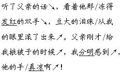 答案 “父亲急忙走过来,帮我掖好被子,连连说:‘我不冷,我不冷,小心别冻着你……’”“父亲刚才给我掖被子的时候,我分明感到,他的手真凉啊!”“但是,我的心里却一直珍藏着那盏冰灯,那是一盏最美的灯。”