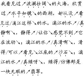 解析 本文语言优美,生动形象。抄写的内容既可以是词语,也可以是句子。词语:荡漾、观赏等。句子:第二、三自然段的排比句,或开篇的句子,或最后一个自然段的句子。总之,只要是你喜欢的词语或句子都可以。