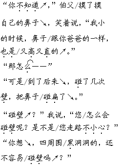 解析 本文的感情基调应是充满怀念、热爱与敬仰的。第一部分要饱含深情,朗读时,语速稍慢,语调低沉。其他部分也要带着对往事怀念、追忆的感情来朗读,语速不可太快,语调平稳,只是在个别段落稍有变化。如伯父笑谈“碰壁”抨击旧社会这一段,可以读得诙谐幽默一些,语气活泼,语调上扬。“我”的语言要显出天真幼稚,语调高昂活泼。朗读伯父救护、帮助车夫和关心女佣阿三这两部分时,语气要深沉凝重,语调低沉,语速稍慢,从中受到感动,进而产生敬仰之情。