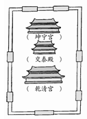 默读课文,想想作者是按怎样的顺序介绍故宫建筑的,跟同学交流交流,然后在示意图中的括号里填上建筑物的名称。