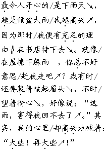 (3)我有时还要装着皱起眉头,不时望着街心,好像说:“这雨,害得我回不去了。”其实,我的心里却高兴地喊着:“大些!再大些!”