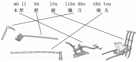●你认识下面的农具吗?这些农具在有些地区已经很少见了。先读一读,然后再跟相应的图连线。