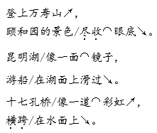 解析 这篇课文语言生动、优美。朗读开头和结尾时,要把突出体现颐和园景物特点的词重读,如第一自然段中的“美丽”,最后一个自然段中的“看也看不尽”。对于具体描写景物的句子,朗读时语速不宜太快,同时要注意语调的变化,读出美感。